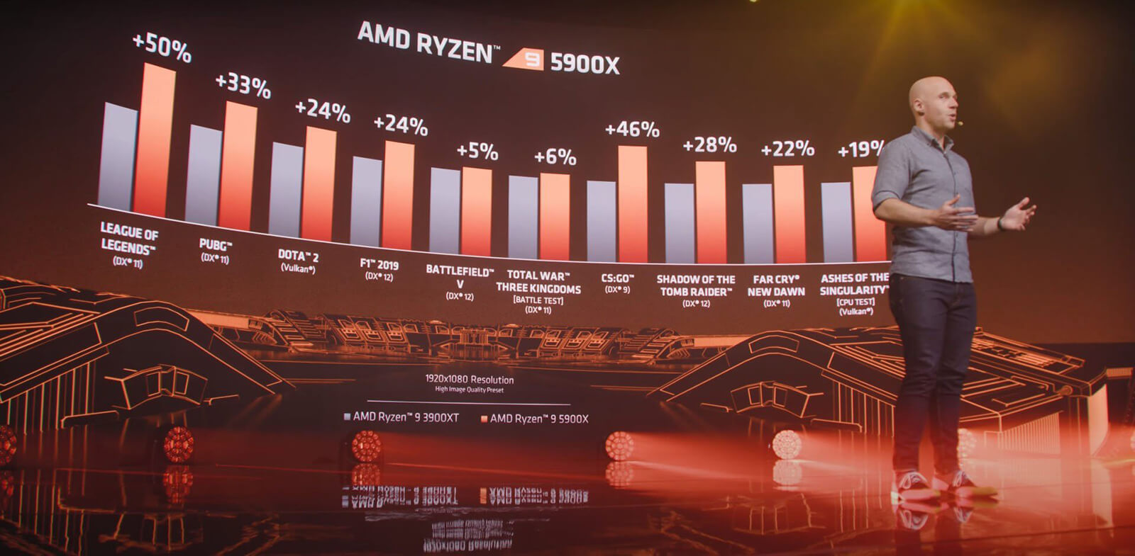 Hiệu năng của Ryzen 9 5900X đã được trình diễn, chẳng hạn như Shadow of the Tomb Raider. Trên cùng hệ thống, Ryzen 9 5900X cho tỉ lệ khung hình 181 fps ở thiết lập đồ họa Highest, độ phân giải FHD, cao hơn 40 fps so với Ryzen 9 3900X hay hiệu năng cao hơn 28%. Bạn hãy xem hình bên dưới để biết sự cải thiện từ đời Ryzen 5000 so với Ryzen 3000 trước đây theo từng tựa game.