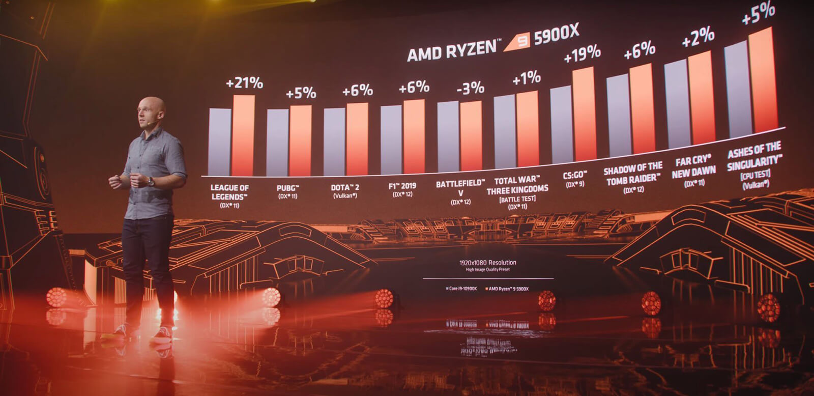 Còn đây là khi so sánh với Intel Core i9-10900K với một loạt các tựa game CPU bound, Ryzen 9 5900X thắng thế trên phần lớn các tựa game.
