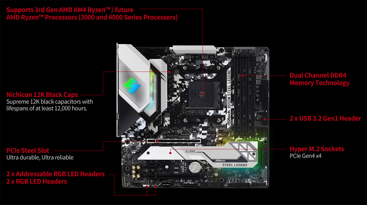 Mainboard Asrock B550M Steel Legend mang đến khả năng cung cấp hiệu suất vô tận với phong cách thép trường tồn.