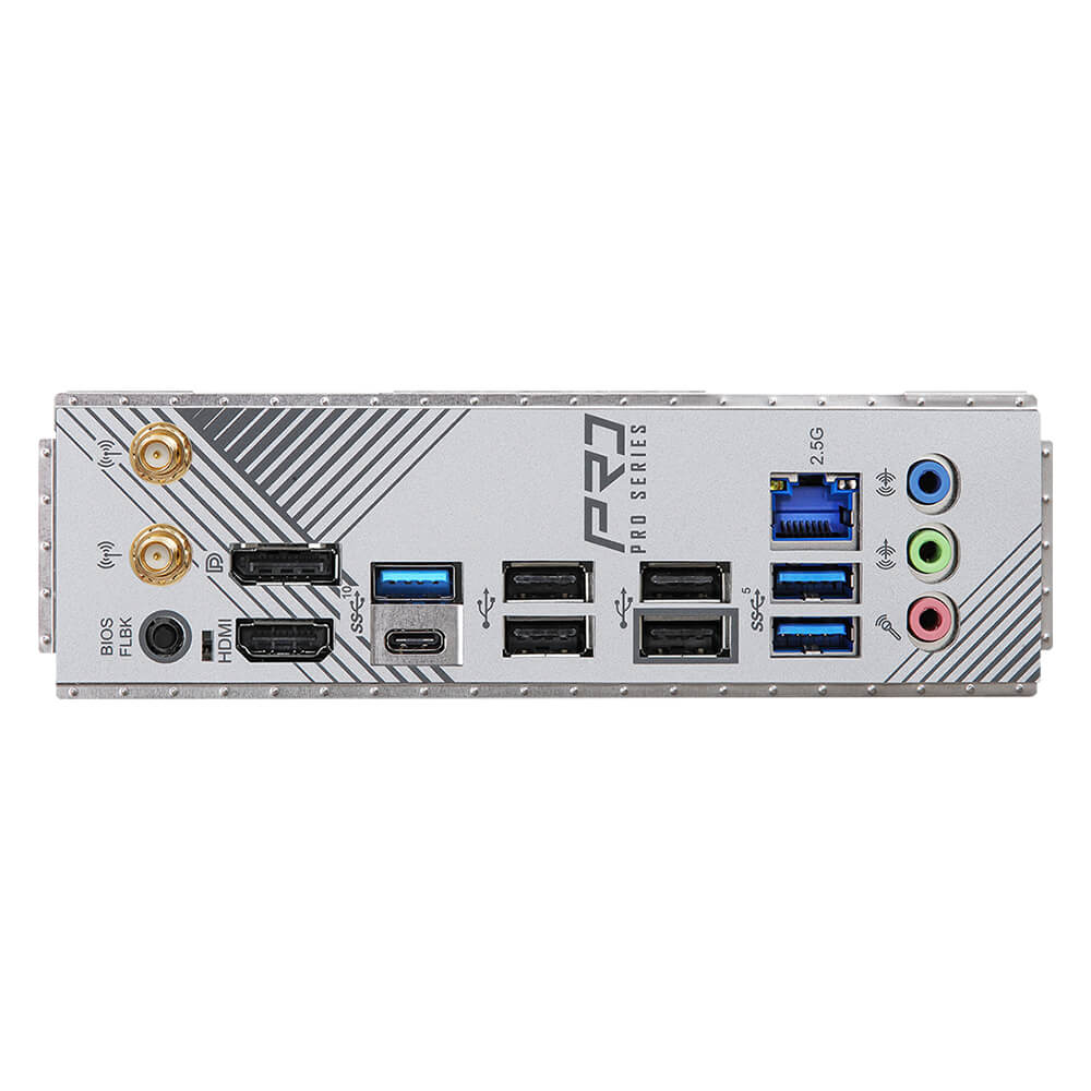 – 2 x Antenna Ports – 1 x HDMI Port – 1 x DisplayPort 1.4 – 1 x USB 3.2 Gen2 Type-A Port (10 Gb/s) – 1 x USB 3.2 Gen2 Type-C Port (10 Gb/s) – 2 x USB 3.2 Gen1 Ports – 4 x USB 2.0 Ports – 1 x RJ-45 LAN Port – 1 x BIOS Flashback Button – HD Audio Jacks: Line in / Front Speaker / Microphone |