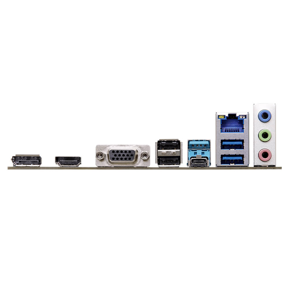 | Rear I/O Ports | – 2 x Antenna Mounting Points – 1 x D-Sub Port – 1 x HDMI Port – 1 x DisplayPort 1.4 – 1 x USB 3.2 Gen1 Type-C Port – 3 x USB 3.2 Gen1 Type-A Ports – 2 x USB 2.0 Ports – 1 x RJ-45 LAN Port – HD Audio Jacks: Line in / Front Speaker / Microphone |