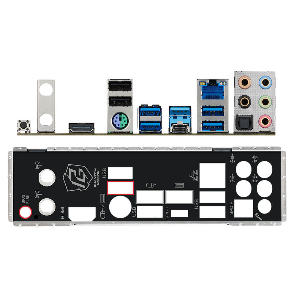 – 1 x Antenna Bracket – 1 x PS/2 Mouse/Keyboard Port – 1 x HDMI Port – 1 x Optical SPDIF Out Port – 1 x USB 3.2 Gen2 Type-A Port (10 Gb/s) (Supports ESD Protection) – 1 x USB 3.2 Gen2 Type-C Port (10 Gb/s) (Supports ESD Protection) – 4 x USB 3.2 Gen1 Ports (Supports ESD Protection)* – 2 x USB 2.0 Ports (Supports ESD Protection) – 1 x RJ-45 LAN Port with LED (ACT/LINK LED and SPEED LED) – 1 x BIOS Flashback Button with LED – HD Audio Jacks: Rear Speaker / Central / Bass / Line in / Front Speaker / Microphone (Gold Audio Jacks) *USB3_2 and USB31_TA_1 are the Lightning Gaming Ports.