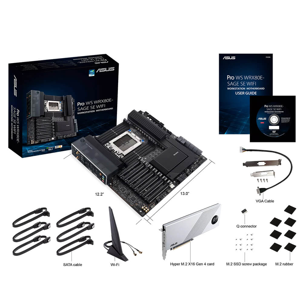 | Accessories | Cables 6 x SATA 6Gb/s cables 1 x VGA cable Miscellaneous 1 x ASUS 2×2 Dual-Band Wi-Fi moving antennas 1 x Hyper M.2 X16 Gen 4 Card 4 x M.2 Rubber Package(s) 6 x M.2 SSD screw package(s) 1 x Q-connector Installation Media 1 x Support DVD Documentation 1 x User manual |