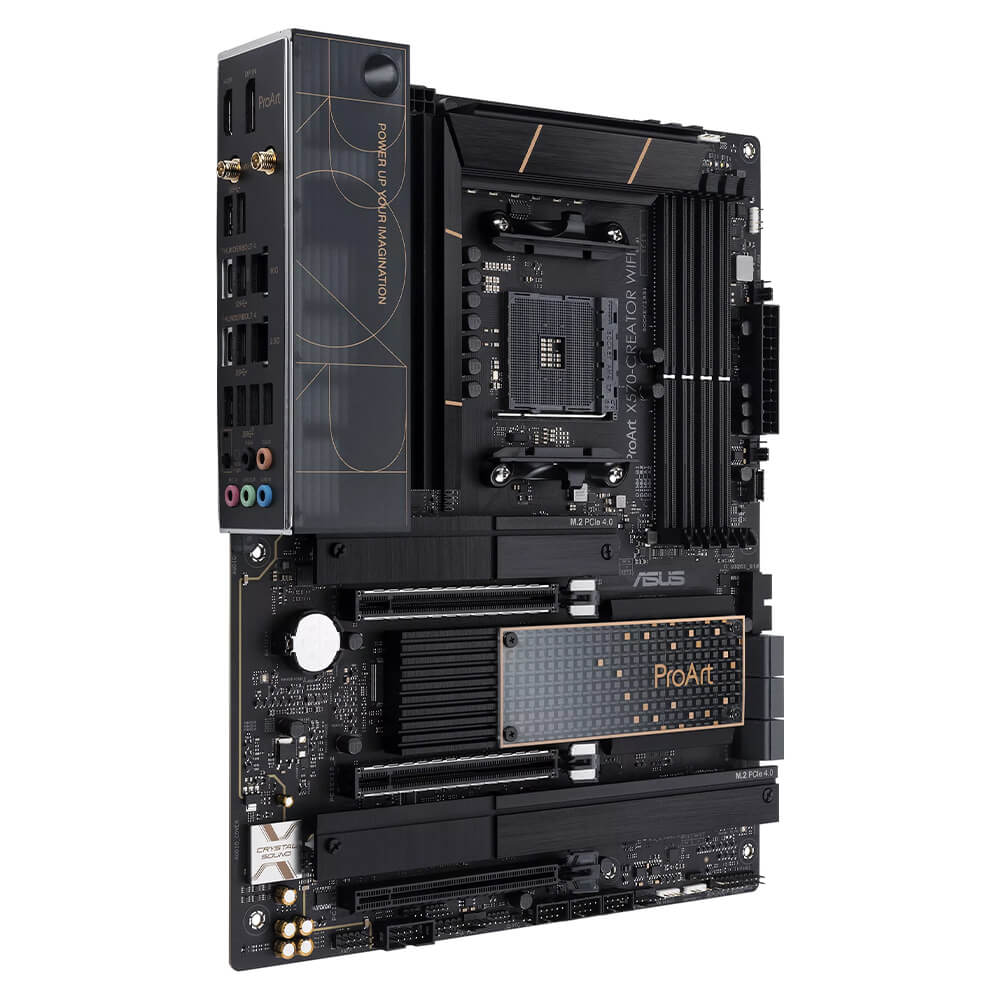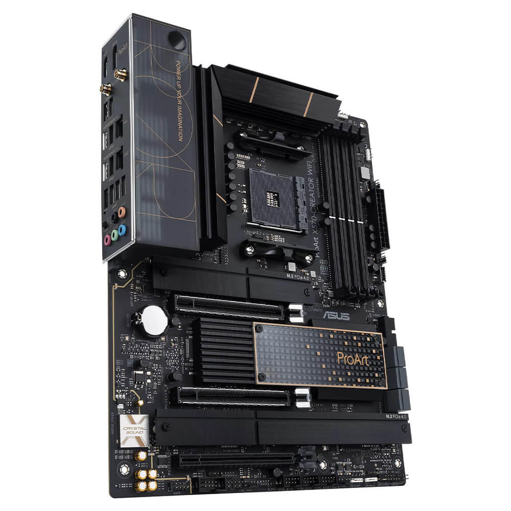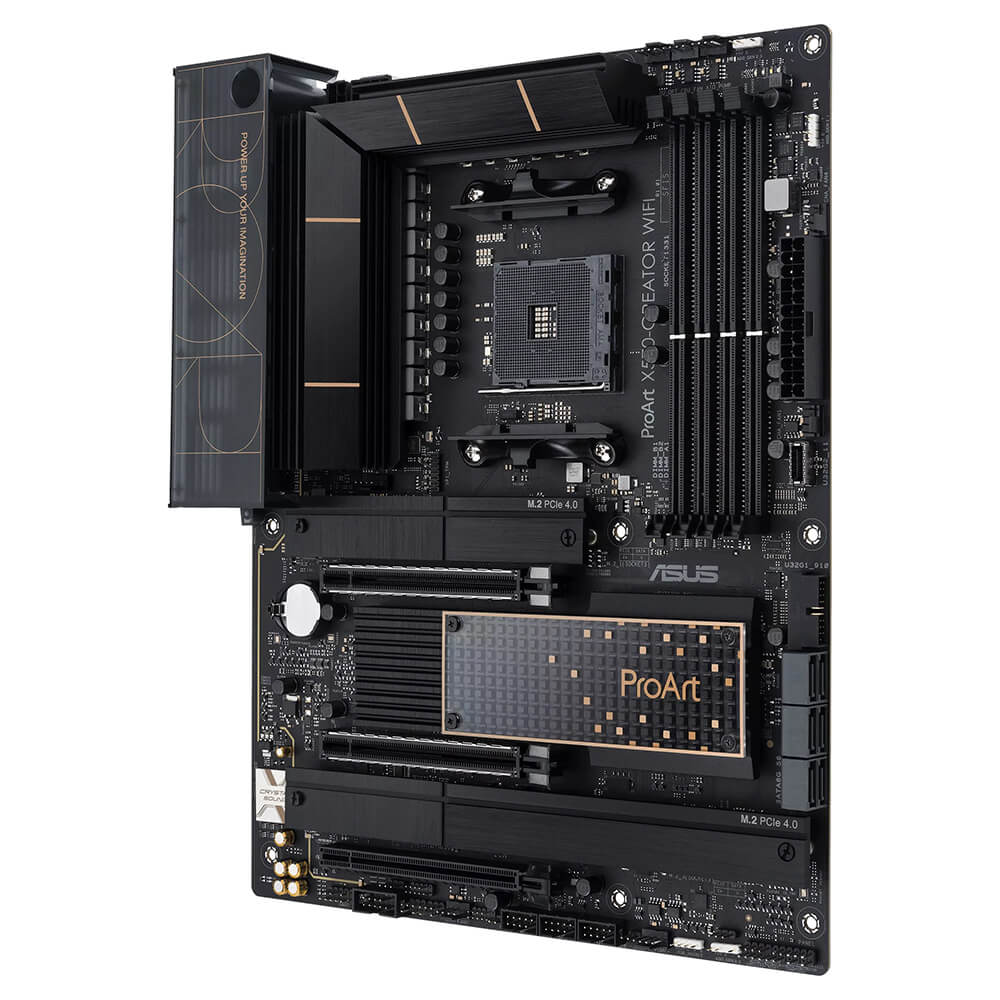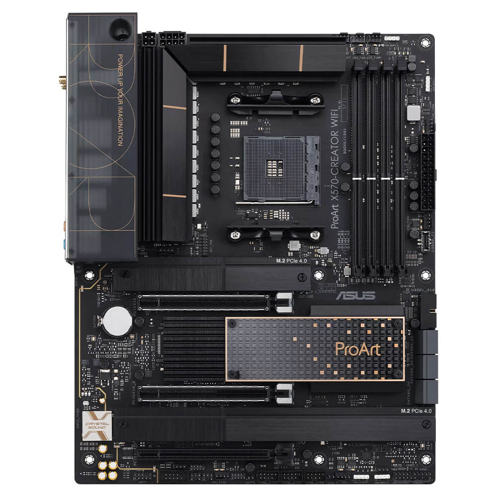 AMD X570 Ryzen AM4 ATX content creation motherboard with PCIe® 4.0, passive PCH cooling design, dual Thunderbolt™ 4 Type-C ports, 10 Gb & 2.5 Gb onboard Ethernet, WiFi 6E, three M.2 with heatsinks, USB 3.2 Gen 2 and advanced security management