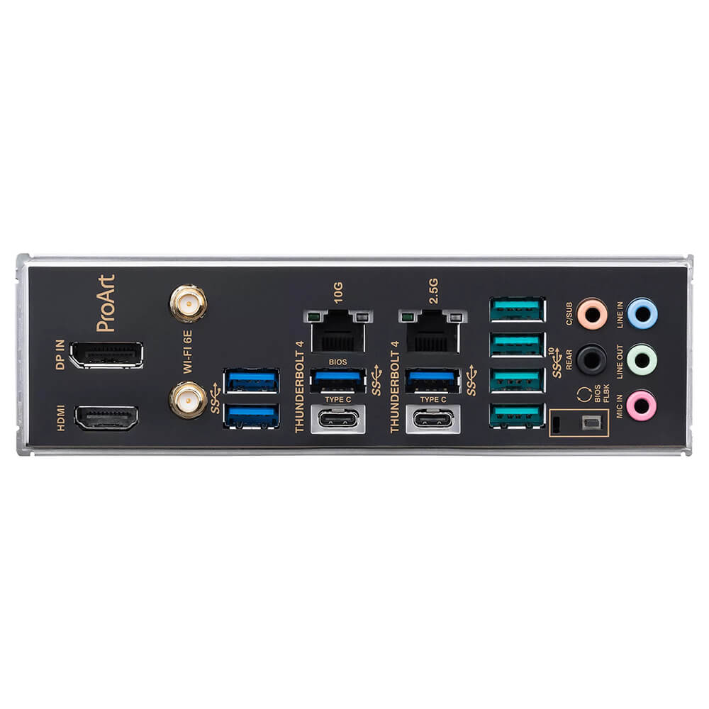 | Back Panel I/O Ports | 2 x Thunderbolt™ 4 USB Type-C® port(s) 4 x USB 3.2 Gen 2 port(s) (4 x Type-A) 4 x USB 3.2 Gen 1 port(s) (4 x Type-A) 1 x DisplayPort (Input only) 1 x HDMI® port 1 x Intel® I225-V 2.5Gb Ethernet port 1 x Marvell® AQtion AQC113CS 10Gb Ethernet port 1 x ASUS Wi-Fi Module 5 x Audio jacks 1 x BIOS FlashBack™ button |