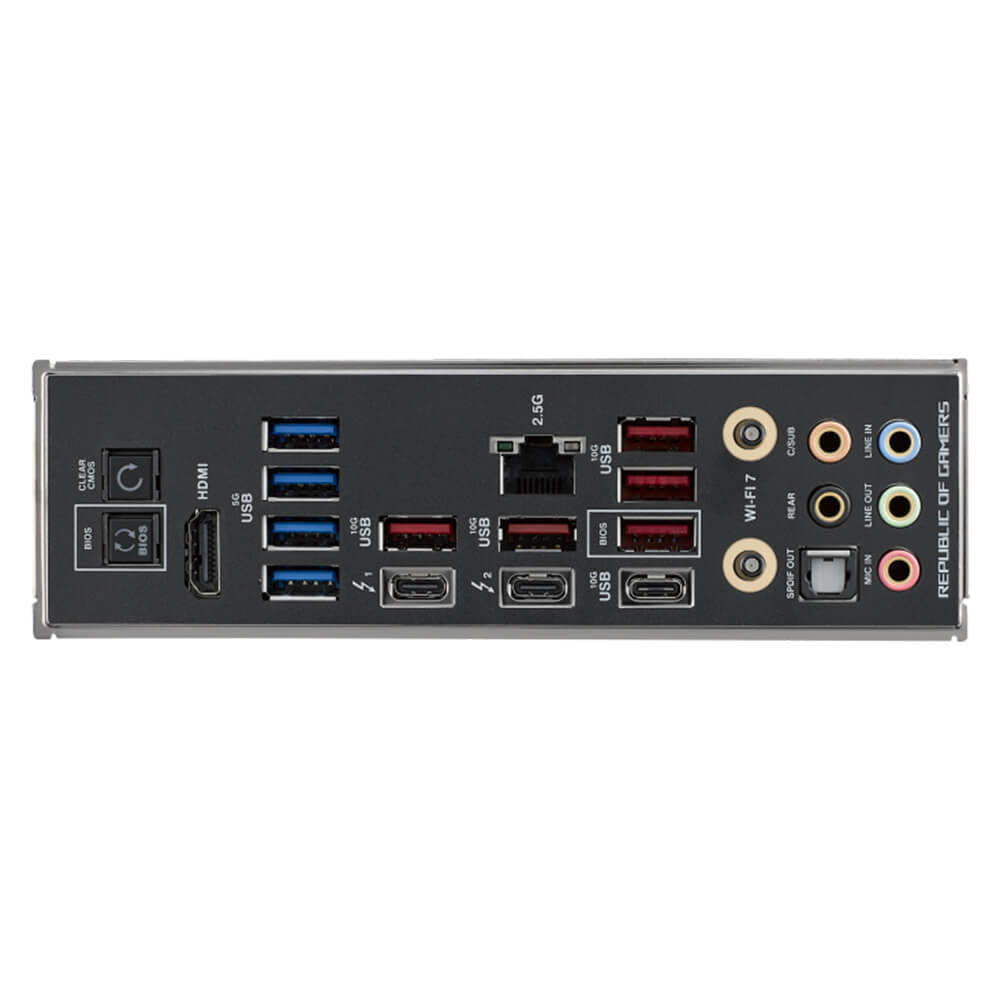 | Back Panel I/O Ports | 2 x Thunderbolt™ 4 USB Type-C® ports 6 x USB 10Gbps ports (5 x Type-A + 1 x USB Type-C®) 4 x USB 5Gbps ports (4 x Type-A) 1 x HDMITM port 1 x Wi-Fi Module 1 x Intel® 2.5Gb Ethernet port 5 x Gold-plated audio jacks 1 x Optical S/PDIF out port 1 x BIOS FlashBack™ button 1 x Clear CMOS button |