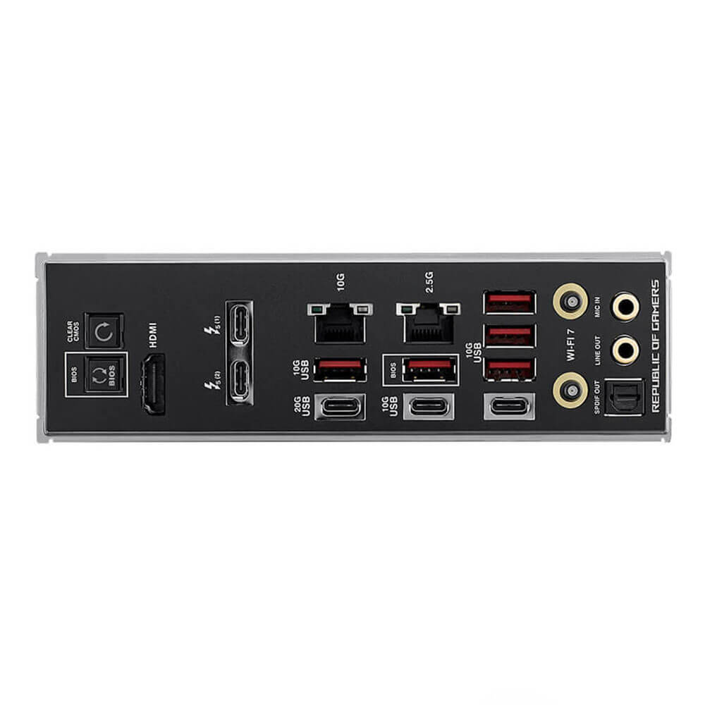 | Back Panel I/O Ports | 2 x Thunderbolt™ 5 USB Type-C® ports 1 x USB 20Gbps port (1 x USB Type-C®) 7 x USB 10Gbps ports (5 x Type-A + 2 x USB Type-C®) 1 x HDMITM port 1 x Wi-Fi Module 1 x Intel® 2.5Gb Ethernet port 1 x Marvell® AQtion 10Gb Ethernet port 2 x LED-illuminated audio jacks 1 x Optical S/PDIF out port 1 x BIOS FlashBack™ button 1 x Clear CMOS button |