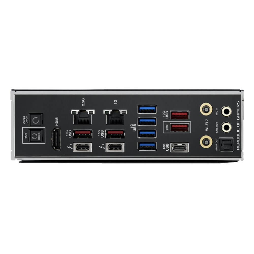 | Back Panel I/O Ports | 2 x Thunderbolt™ 4 USB Type-C® ports 5 x USB 10Gbps ports (4 x Type-A + 1 x USB Type-C®) 4 x USB 5Gbps ports (4 x Type-A) 1 x HDMI™ port 1 x Wi-Fi module 1 x Intel® 2.5Gb Ethernet port 1 x Realtek 5Gb Ethernet port 2 x Gold-plated audio jacks 1 x Optical S/PDIF out port 1 x BIOS FlashBack™ button 1 x Clear CMOS button |