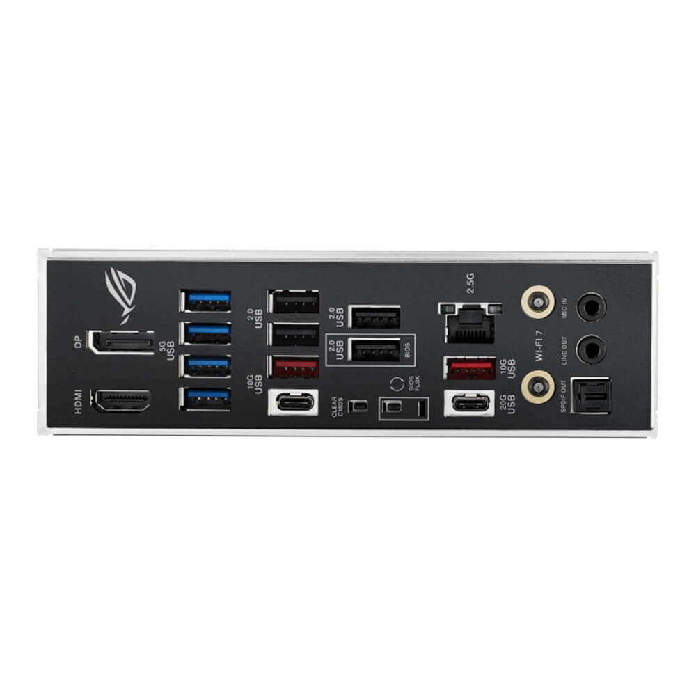 | Back Panel I/O Ports | 1 x USB 20Gbps port (1 x USB Type-C®) 3 x USB 10Gbps ports (2 x Type-A + 1 x USB Type-C®) 4 x USB 5Gbps ports (4 x Type-A) 4 x USB 2.0 ports (4 x Type-A) 1 x DisplayPort 1 x HDMI™ port 1 x Wi-Fi module 1 x Intel® 2.5Gb Ethernet port 2 x Audio jacks 1 x Optical S/PDIF out port 1 x BIOS FlashBack™ button 1 x Clear CMOS button |