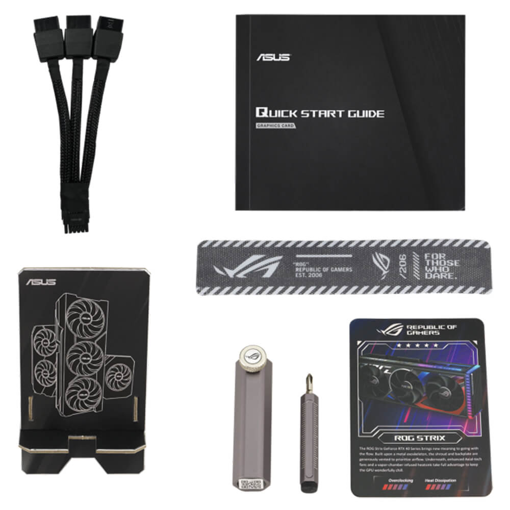 | Accessories | 1 x Collection Card 1 x Speedsetup Manual 1 x Adapter Cable (1 to 3) 1 x ROG White Graphics Card Holder 1 x ROG White Velcro Hook & Loop 1 x Thank you Card |