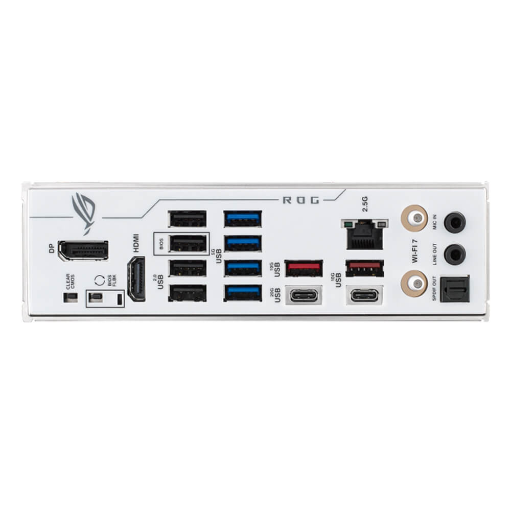 | Back Panel I/O Ports | 1 x USB 20Gbps port (1 x USB Type-C®) 3 x USB 10Gbps ports (2 x Type-A+1 x USB Type-C®) 4 x USB 5Gbps ports (4 x Type-A) 4 x USB 2.0 ports (4 x Type-A) 1 x DisplayPort 1 x HDMI™ port 1 x Wi-Fi module 1 x Intel® 2.5Gb Ethernet 2 x Audio jacks 1 x Optical S/PDIF out port 1 x BIOS FlashBack™ button 1 x Clear CMOS button |