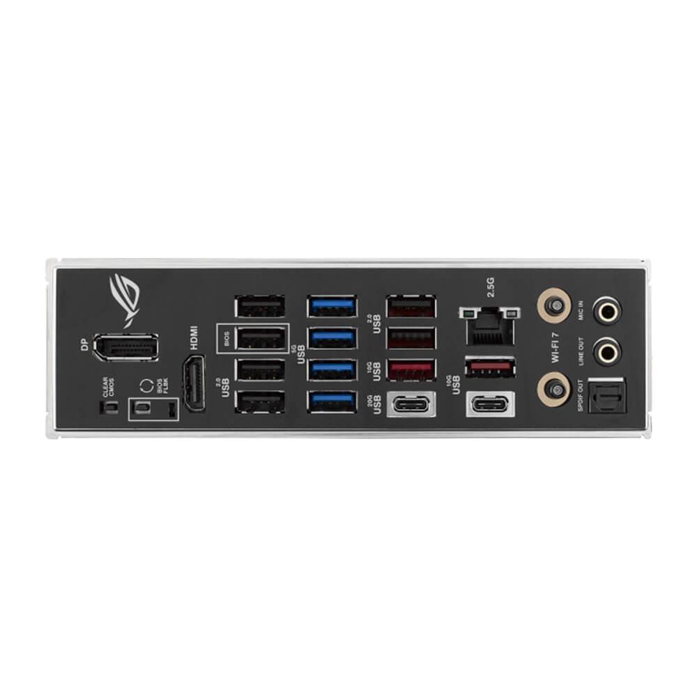 | Back Panel I/O Ports | 1 x USB 20Gbps port (1 x USB Type-C®) 3 x USB 10Gbps ports (2 x Type-A+1 x USB Type-C®) 4 x USB 5Gbps ports (4 x Type-A) 6 x USB 2.0 ports (6 x Type-A) 1 x DisplayPort 1 x HDMITM port 1 x Wi-Fi Module 1 x Intel® 2.5Gb Ethernet 2 x Gold-plated audio jacks 1 x Optical S/PDIF out port 1 x BIOS FlashBack™ button 1 x Clear CMOS button |