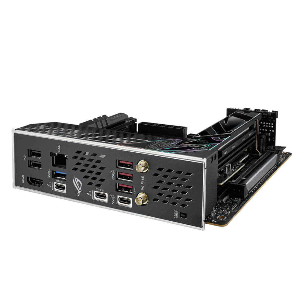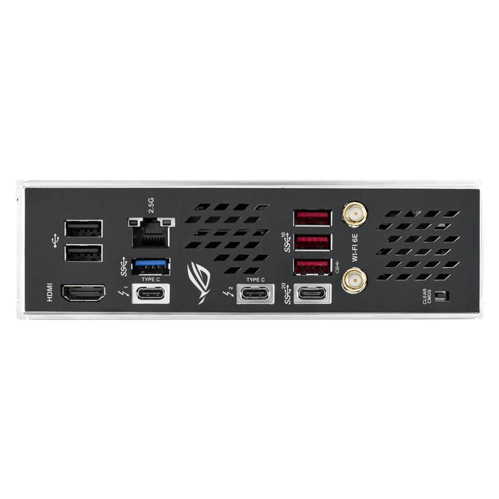 | Back Panel I/O Ports | 2 x Thunderbolt™ 4 USB Type-C® port(s) 1 x USB 3.2 Gen 2×2 port(s) (1 x USB Type-C®) 3 x USB 3.2 Gen 2 port(s) (3 x Type-A) (supports ROG STRIX HIVE) 1 x USB 3.2 Gen 1 port(s) (1 x Type-A) 2 x USB 2.0 port(s) (2 x Type-A) 1 x HDMI® port 1 x Wi-Fi Module 1 x Intel® 2.5Gb Ethernet port 1 x Clear CMOS button |