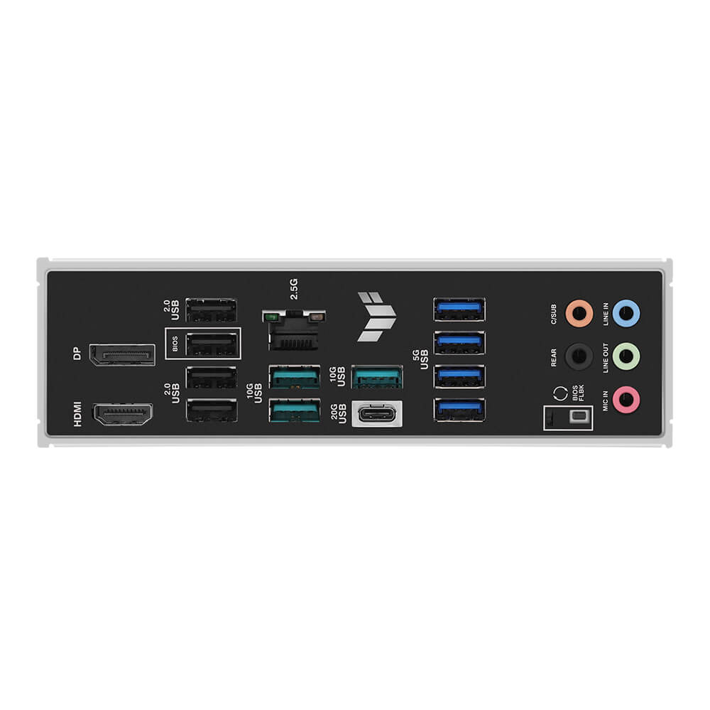 | Back Panel I/O Ports | 1 x USB 20Gbps port (1 x USB Type-C®) 3 x USB 10Gbps ports (3 x Type-A) 4 x USB 5Gbps ports (4 x Type-A) 4 x USB 2.0 ports (4 x Type-A) 1 x DisplayPort 1 x HDMI™ port 1 x Wi-Fi module 1 x Realtek 2.5Gb Ethernet port 5 x Audio jacks 1 x BIOS FlashBack™ button |
