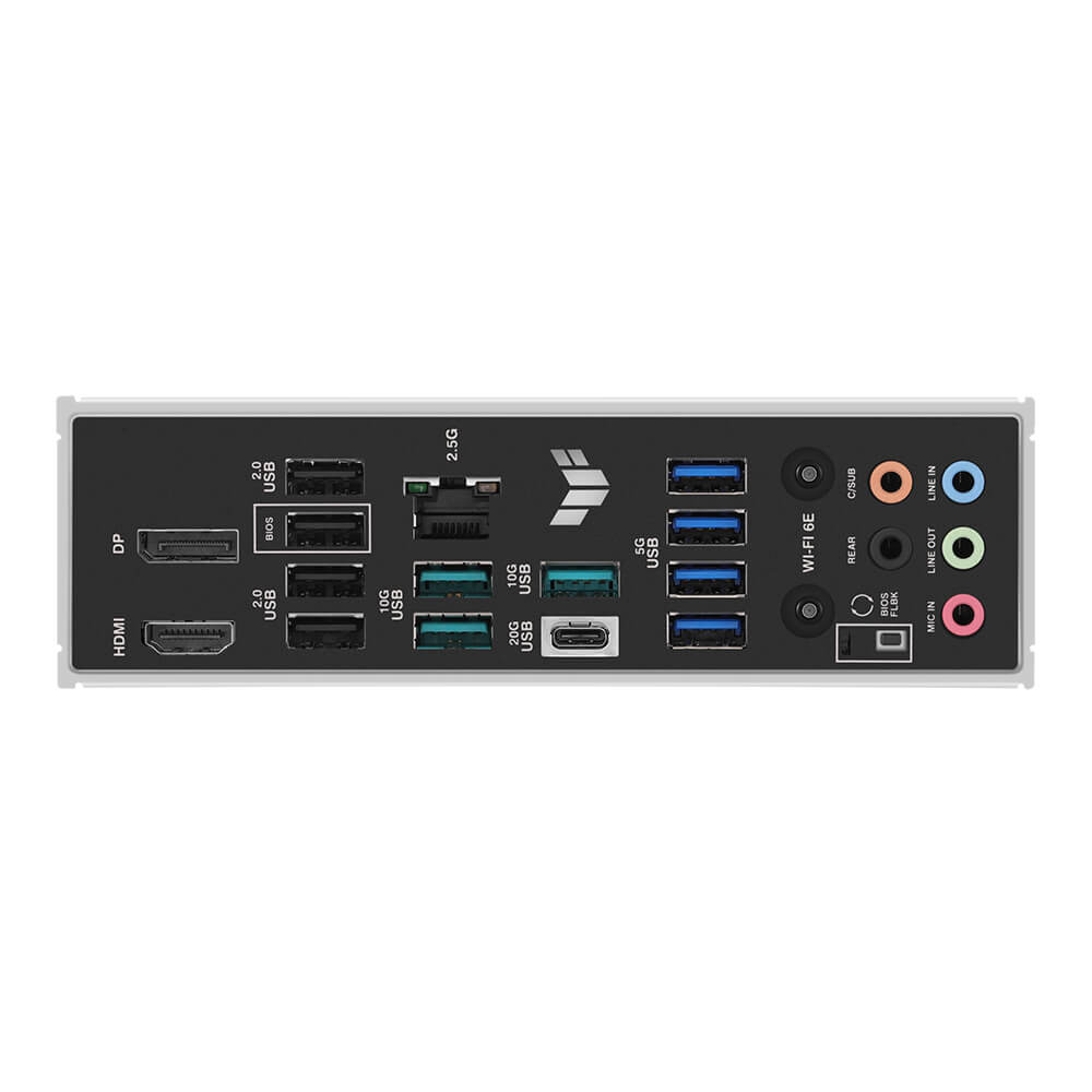| Back Panel I/O Ports | 1 x USB 20Gbps port (1 x USB Type-C®) 3 x USB 10Gbps ports (3 x Type-A) 4 x USB 5Gbps ports (4 x Type-A) 4 x USB 2.0 ports (4 x Type-A) 1 x DisplayPort 1 x HDMI™ port 1 x Wi-Fi module 1 x Realtek 2.5Gb Ethernet port 5 x Audio jacks 1 x BIOS FlashBack™ button |