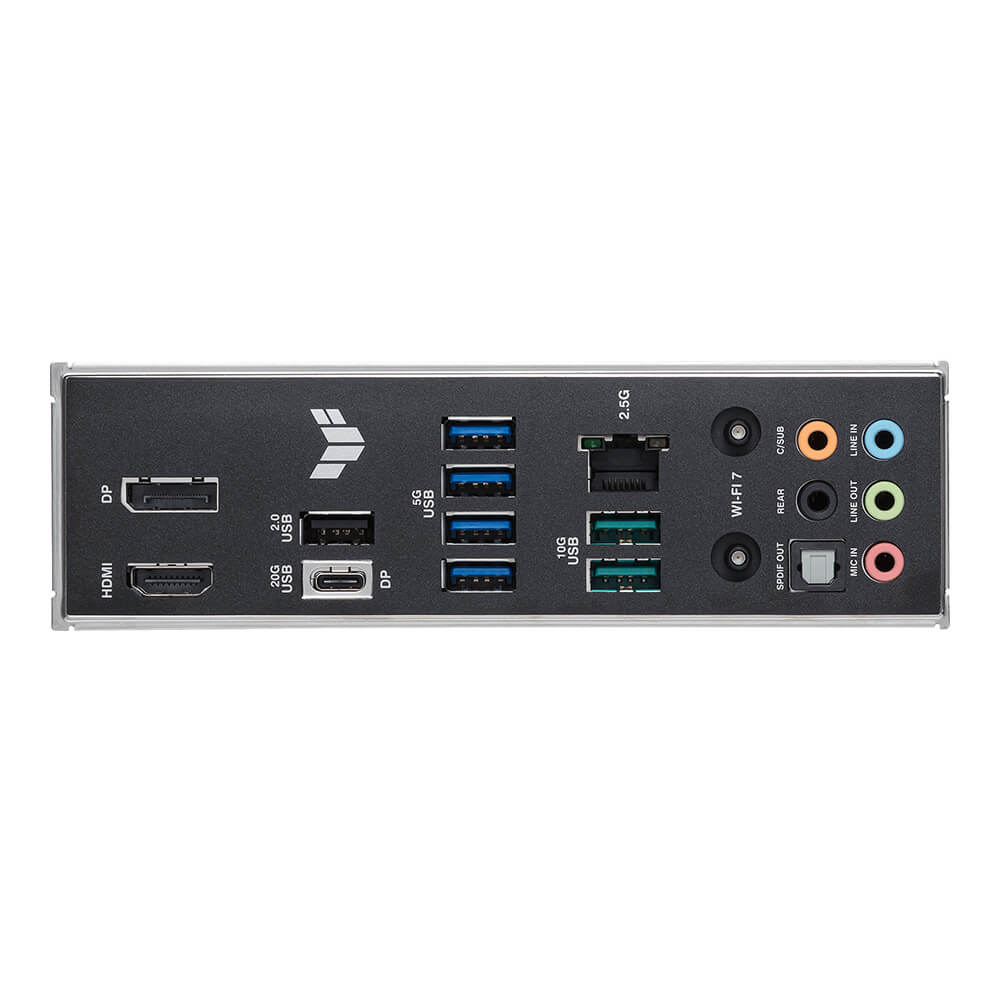 | Back Panel I/O Ports | 1 x USB 20Gbps port (1 x USB Type-C® with DP Alt mode) 2 x USB 10Gbps port (2 x Type-A) 4 x USB 5Gbps ports (4 x Type-A) 1 x USB 2.0 port (1 x Type-A) 1 x DisplayPort 1 x HDMI™ port 1 x Wi-Fi Module 1 x Realtek 2.5Gb Ethernet port 5 x Audio jacks 1 x Optical S/PDIF out port |