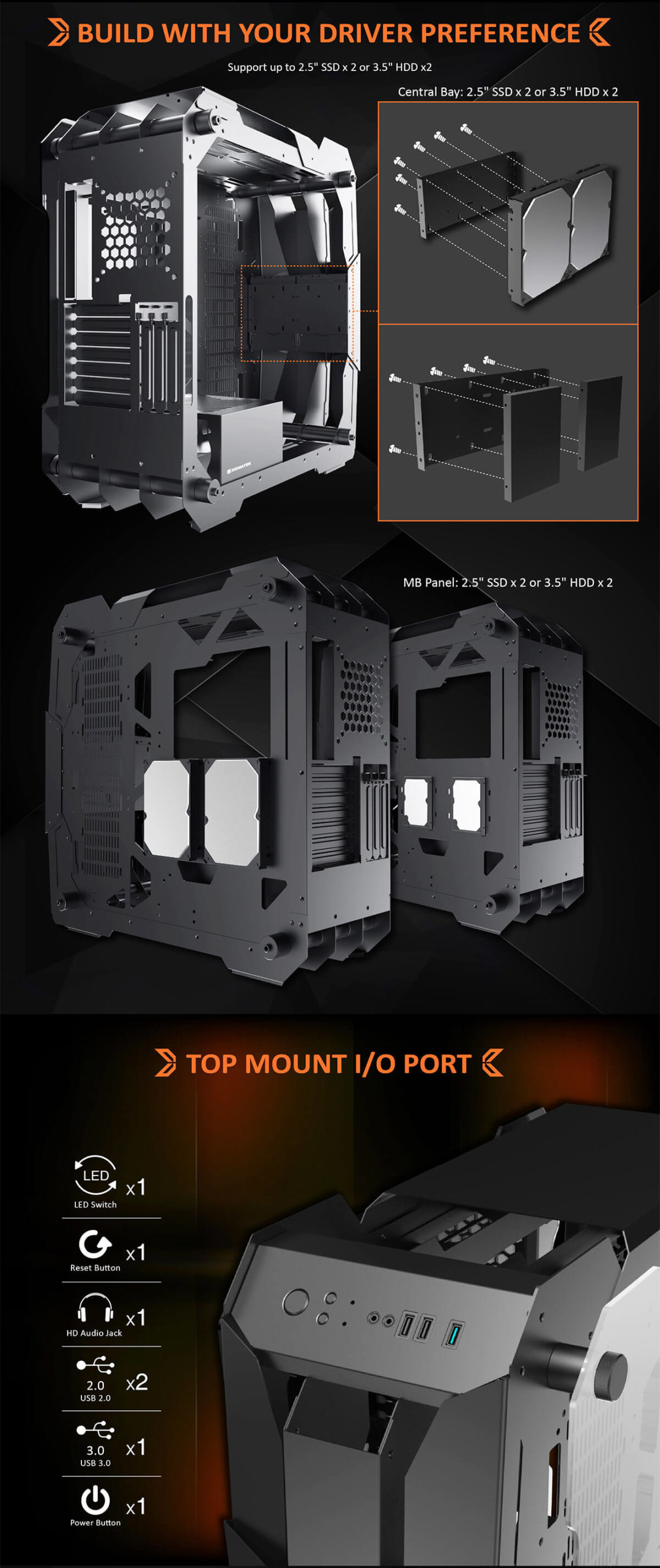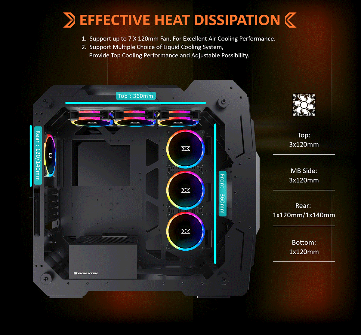| Hệ thống làm mát ( Quạt ) | Top: 3 x 120mm MB Side: 3 x 120mm Rear: 1 x 120mm or 1x 140mm Bottom: 1 x 120mm |