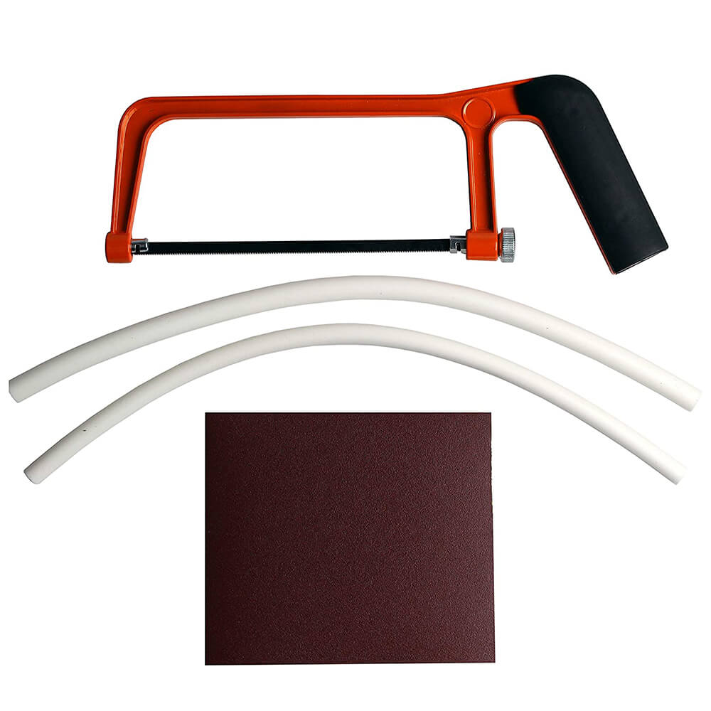 Using heat gun and the enclosed silicone cord (rod) it is possible to make customized pieces of solid tubing. Use hacksaw to cut pieces to lenght and sandpaper to chamfer and smooth out the edges.