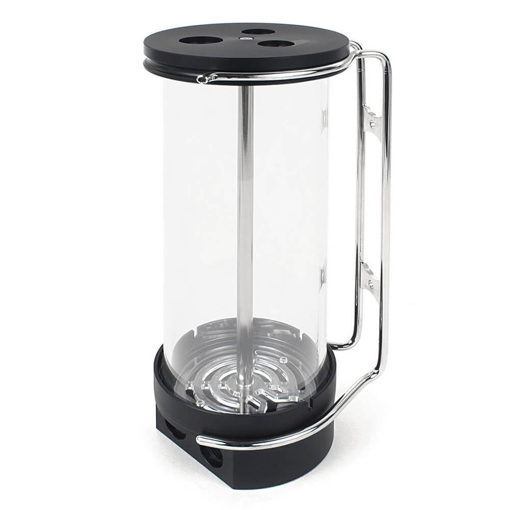 EK-RES X4 (R2.0) is a large high-quality standalone cylindrical reservoir. The first major distinction from the RES X3 is its sheer size with 250mm in height and the use of 80mm wide borosilicate glass tube. This provides a vast volume which allows the reservoir to hold up to 0.8 liters of liquid. This updated (R2.0) version of the EK-RES X4 features a nickel plated brass pillar that holds the top and bottom part of the reservoir together. It can be disassembled much more easily as its predecessor with the enclosed Allen key.
