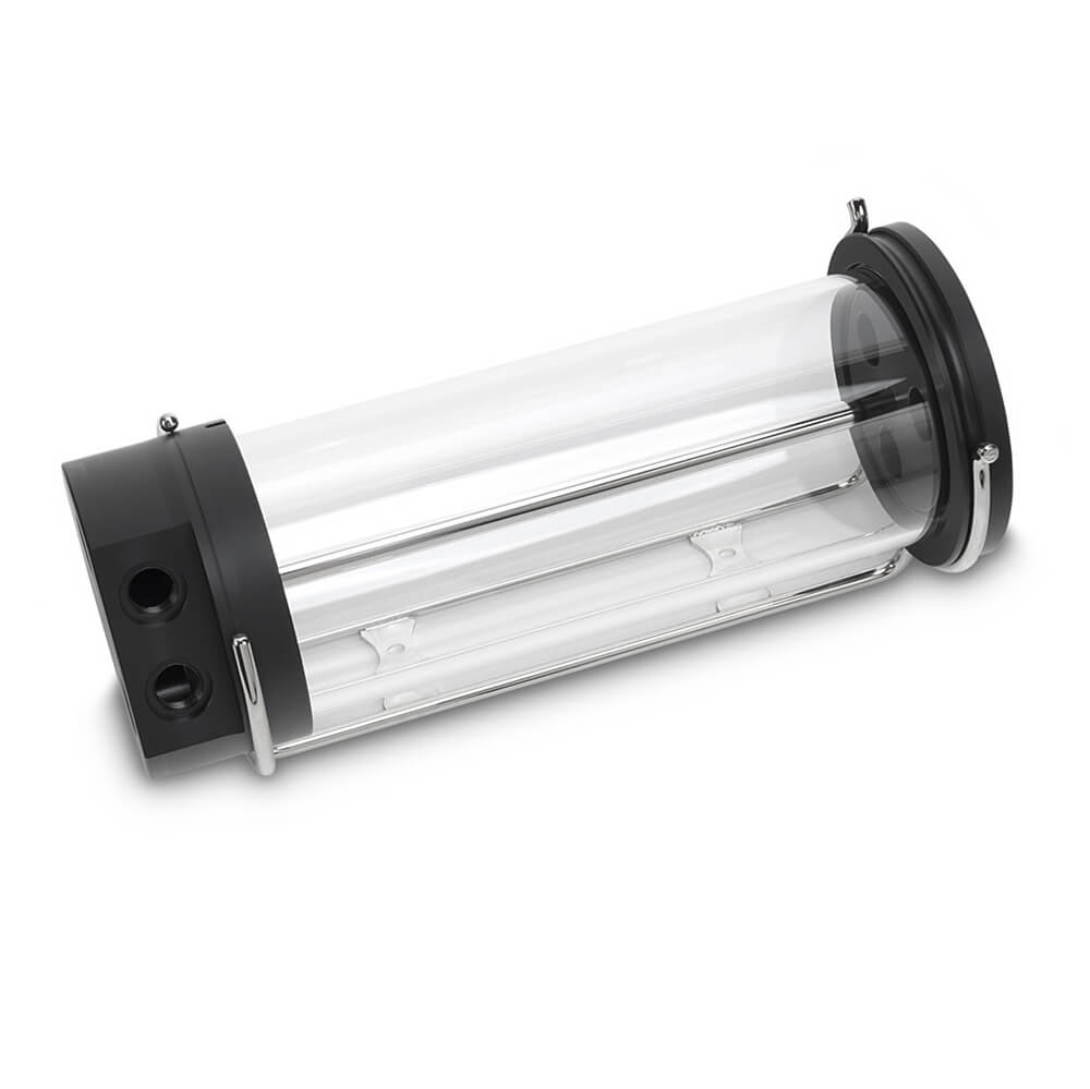 EK-RES X4 250 is a standalone high-quality cylindrical reservoir with borosilicate glass tube. The reservoir is packed with multiple ports, it features a total of 8 ports, offers multiple mounting options and comes with an enclosed white Bright Light LED strip.