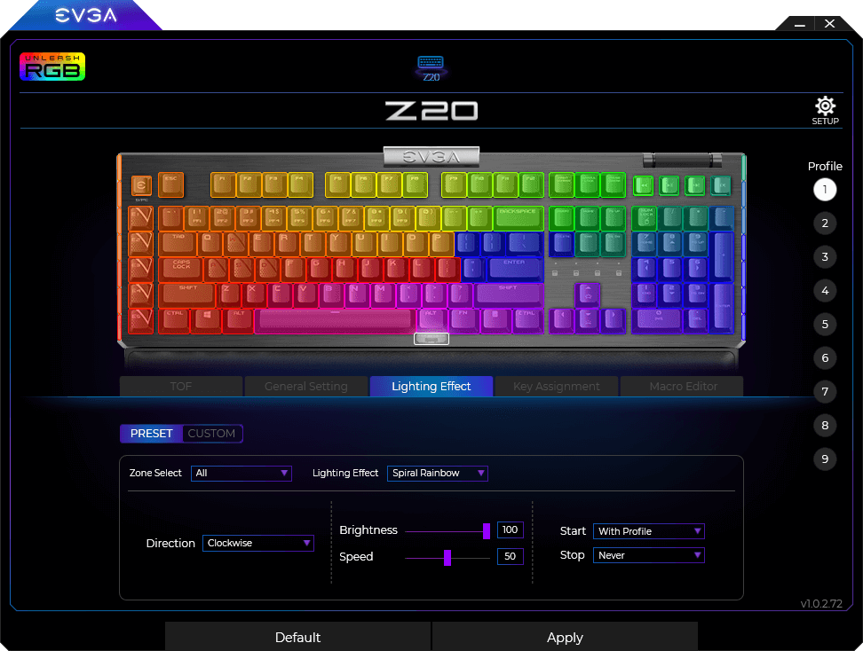 Người dùng có thể tạo đến 9 Profile khác nhau theo sở thích. Tùy chỉnh LED, tốc độ LED hoặc sử dụng các profile LED có sẵn. Ngoài ra còn có thể tùy chỉnh các chức năng khác nhau như Macro, Report rate thông qua phần mềm này.