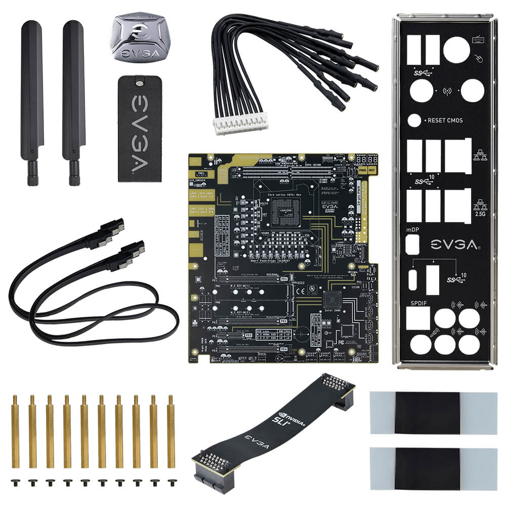 | ACCESSORIES | EVGA Quick Installation Guide Rear Case I/O Panel 2 SATA 6G Data Cables 2x M.2 Thermal Pad 2x Antenna for WiFi Benchstand + Screws/Standoffs 2x ProbeIt Connectors Flexible SLI® Bridge Case Badge USB Flash Drive Contains Driver and Manual |