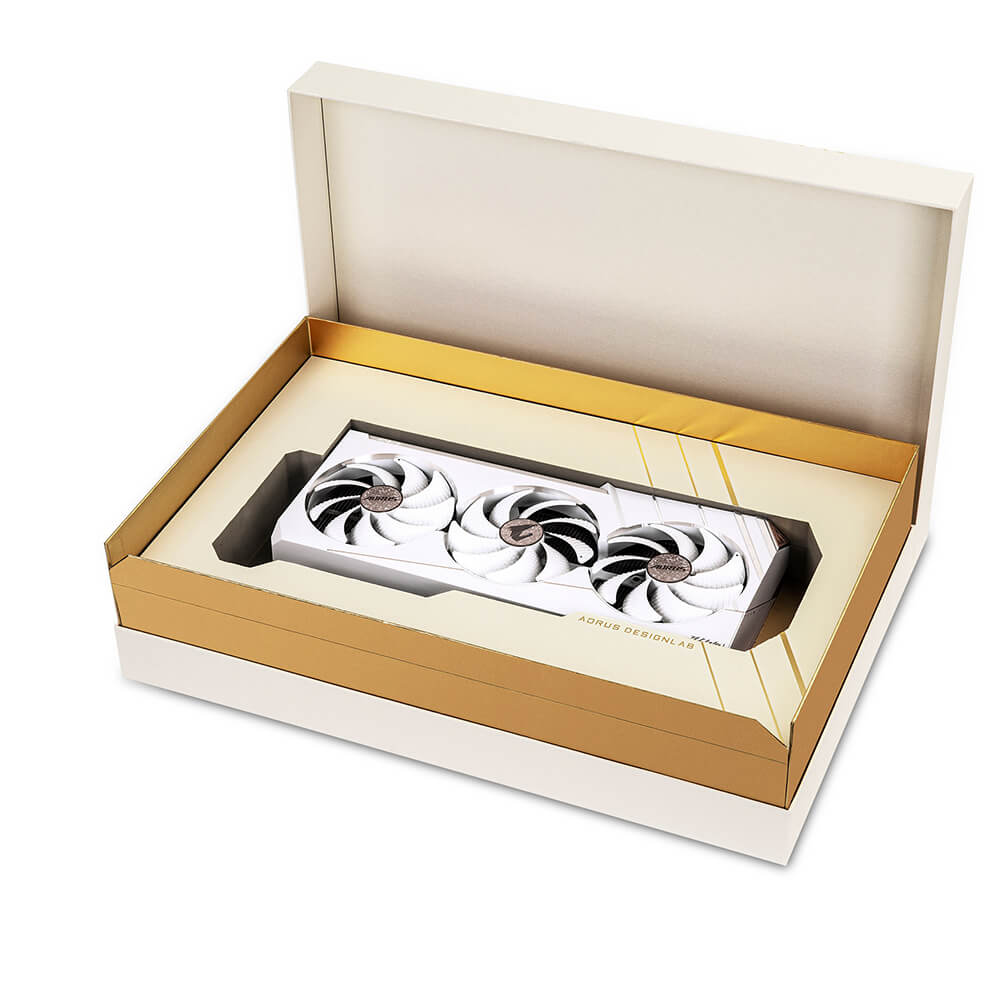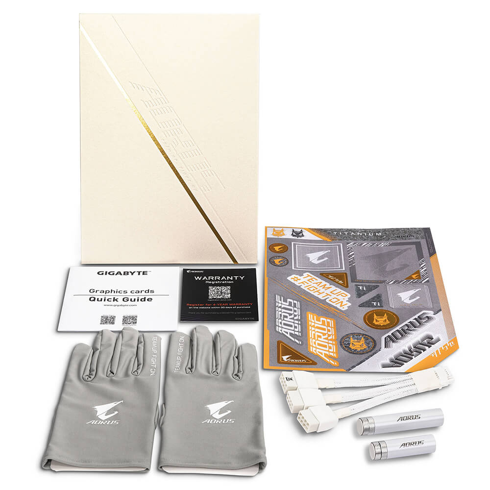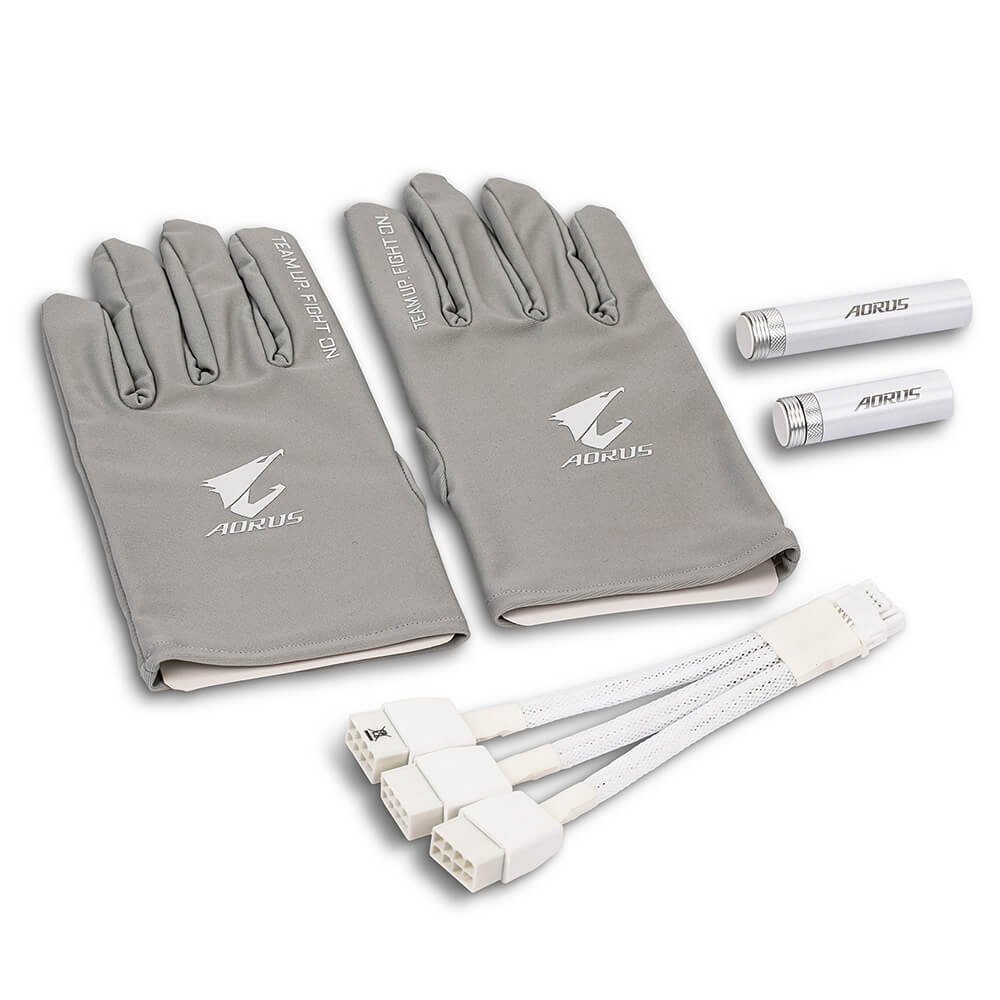 | Accessories | 1. Quick guide 2. Warranty registration 3. Gold guarantee card 4. One 16 pin to triple 8-pin power adaptor 5. VGA holder kit 6. AORUS anti-static gloves 7. AORUS sticker |