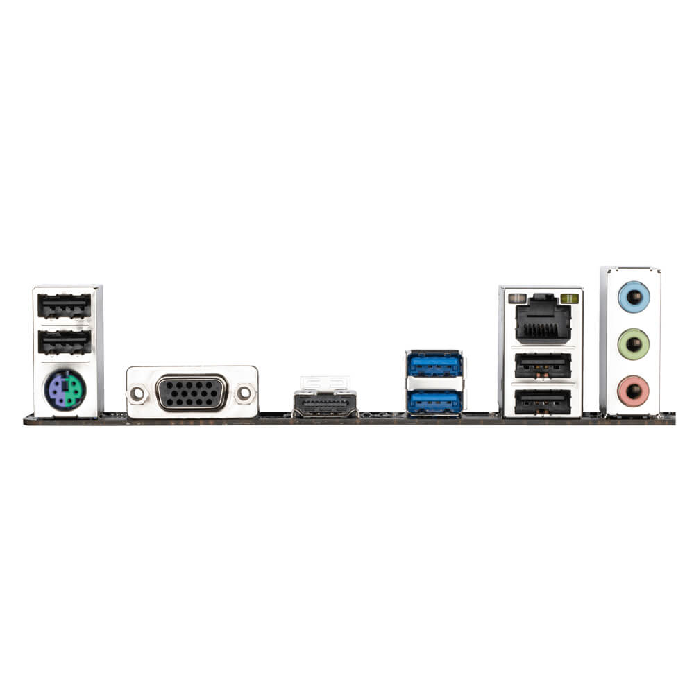| Kết nối ngoài | 1 x PS/2 keyboard/mouse port 1 x D-Sub port 1 x HDMI port 2 x USB 3.2 Gen 1 ports 4 x USB 2.0/1.1 ports 1 x RJ-45 port 3 x audio jac |