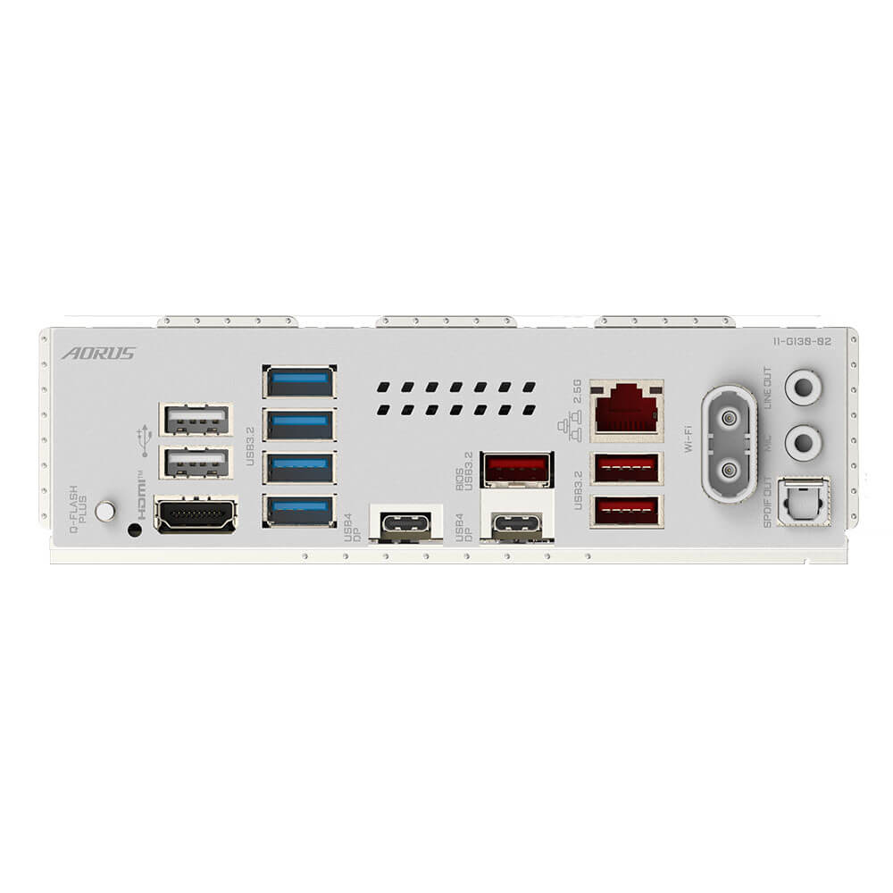 | Back Panel Connectors | 1 x Q-Flash Plus button 2 x USB 2.0/1.1 ports 1 x HDMI port (Note) 4 x USB 3.2 Gen 1 ports 2 x USB4® USB Type-C® port (DisplayPort (Note)) 3 x USB 3.2 Gen 2 Type-A ports (red) 1 x RJ-45 port 2 x antenna connectors (2T2R) 1 x optical S/PDIF Out connector 2 x audio jacks |