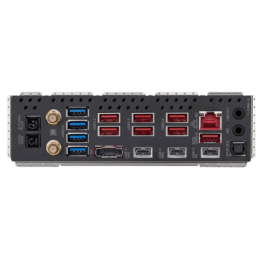 | Back Panel Connectors | 1 x Q-Flash Plus button 1 x Clear CMOS button 2 x SMA antenna connectors (2T2R) 1 x DisplayPort 1 x USB Type-C® port, with USB 3.2 Gen 1 support 2 x USB Type-C® ports, with USB 3.2 Gen 2×2 support 7 x USB 3.2 Gen 2 Type-A ports (red) 4 x USB 3.2 Gen 1 ports 1 x RJ-45 port 1 x optical S/PDIF Out connector 2 x audio jacks |