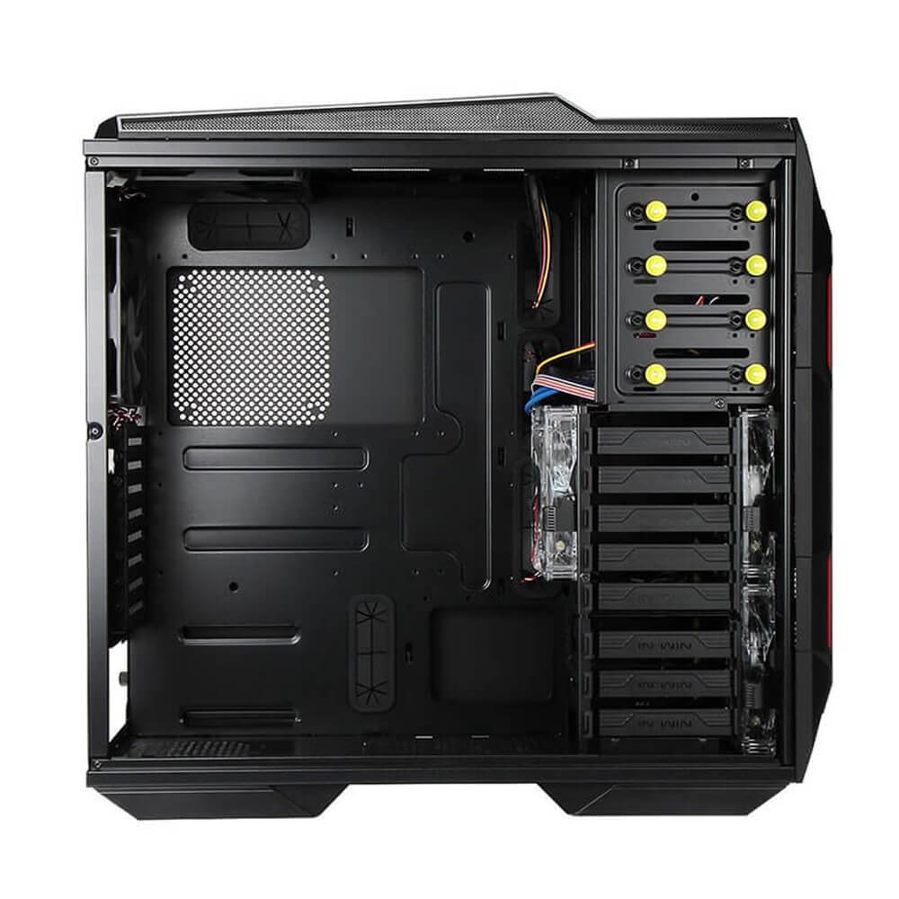 | Thermal Solution Compatibility | 2 x 120/140mm Front Fan 1 x 120/140mm Rear Fan 1 x 120/140mm Side Fan 3 x 120/140mm Top Fan 2 x 120/140mm Bottom Fan 1 x 120/140mm HDD Cage Fan 1 x 360mm Top Radiator 1 x 240mm Bottom Radiator CPU Heatsink Compatible – CPU die surface to side panel height: 195mm Maximum |