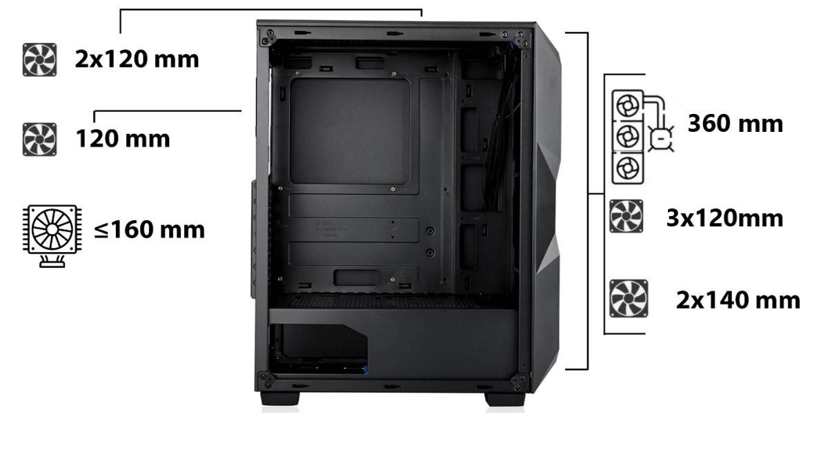 - phía trước có thể gắn được (3 fan x 120mm) & (2 fan x 140mm)