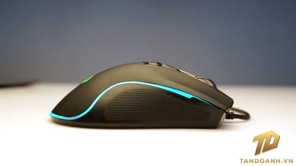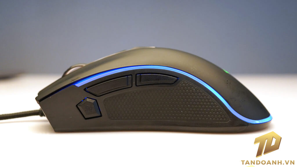 Hai bên chuột được thiết kế “sần” tạo cảm giác nắm chắc chắn khi cầm. Axe còn có thêm nút Targen để có thể dể dàng chơi các game FPS.