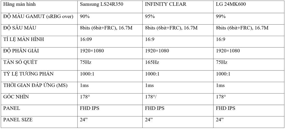 Ở đây sẽ so sánh với màn Samsung LS24R350 và LG 24MK600