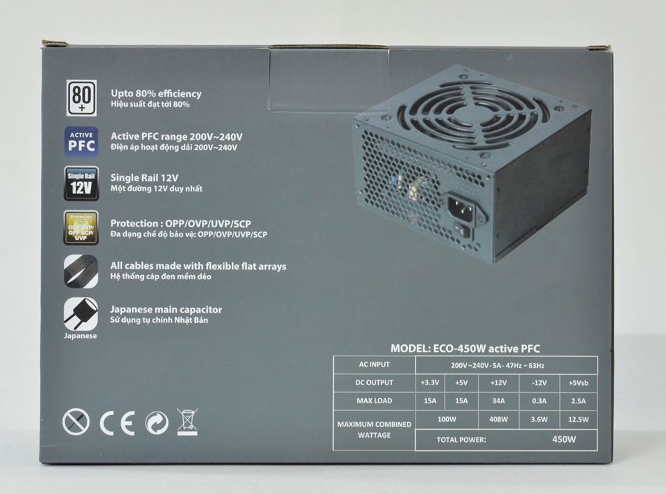 Hộp có ECO 450W có kích thước nhỏ nhắn tông màu xám . các thông số và các tính năng chính được in chi tiết ở các mặt của hộp.