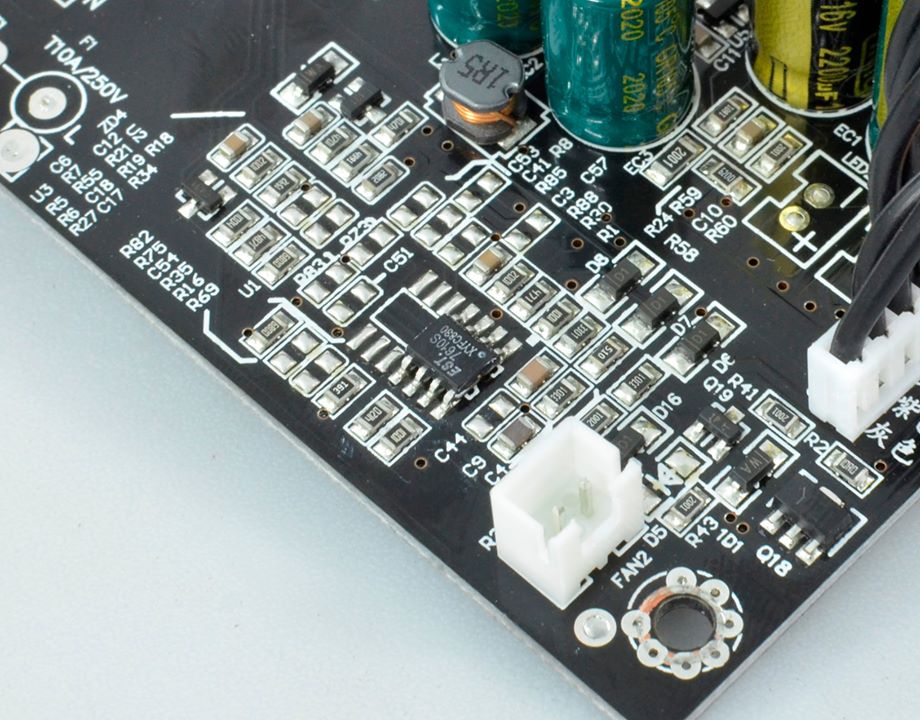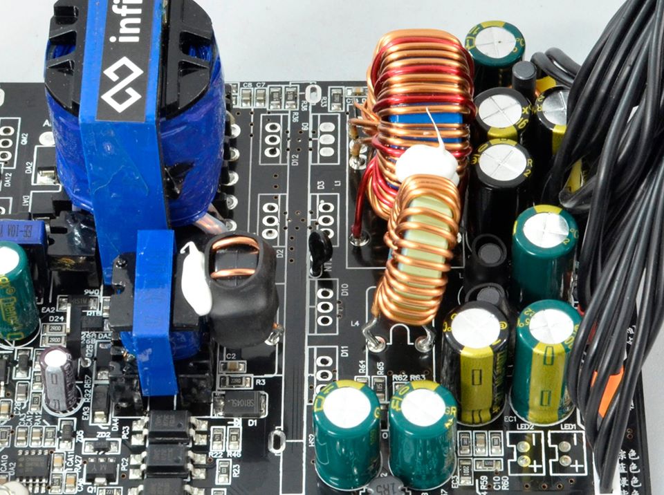 Infinity ECO 450W sử dụng IC giám sát hoạt động EST7610S cung cấp 3 chức năng bảo vệ cơ bản OVP/UVP/SCP. Các tụ lọc nhiễu đầu ra đều đến từ hãng ChengX có mức nhiệt độ chịu đựng tối đa là 105oC