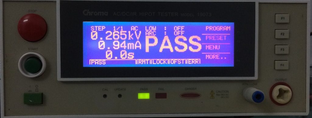 Đối với các thiết bị IT (Class I) mà nguồn máy tính ATX là một trong số đó thì theo tiêu chuẩn an toàn yêu cầu dòng rò không được vượt quá 3,5mA tại áp cấp vào bằng ~110% điện áp tối đa mà nhà sản xuất công bố PSU có thể hoạt động đc (ở đây sẽ là 110% của 230VAC tương đương khoảng 253VAC@60Hz). Để kiểm tra vấn đề này chúng ta sẽ sử dụng thiết bị chuyên dụng Chroma 19073 Hipot tester để đo dòng rò