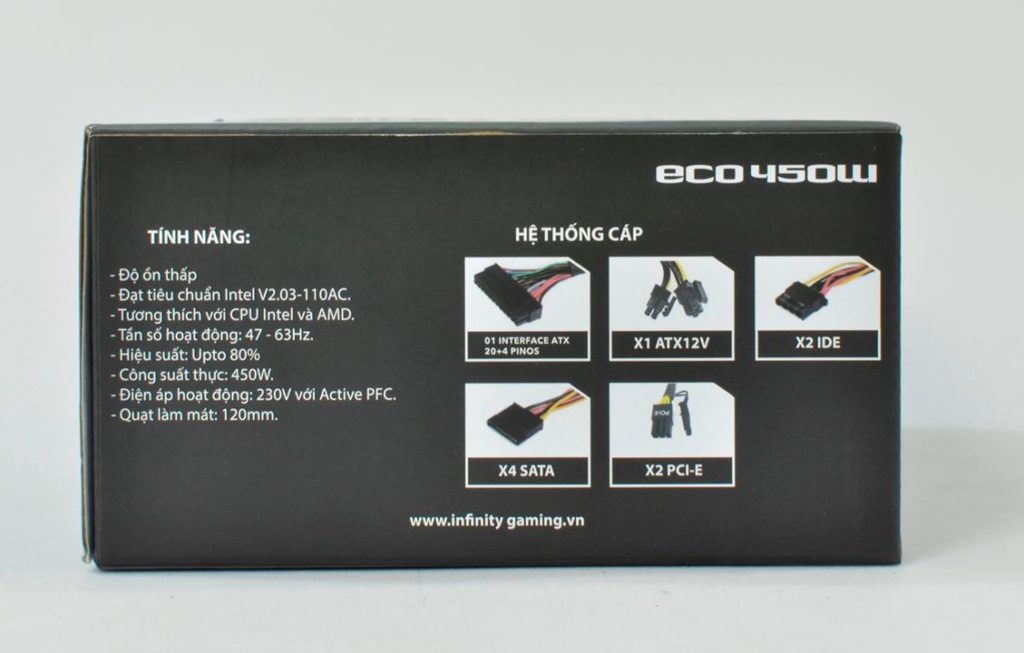Infinity ECO 450W có phẩm chất điện áp và chất lượng linh kiện khá. Hiệu suất trên 80%. được trang bị hệ thống cáp đen mềm hợp thời. Sẽ là hơi “quá đà” nếu nó Infinity ECO 450W là 1 sản phẩm có chất lượng cao. Nhưng trong phân khúc “nguồn cỏ” của mình, Infinity ECO 450W đã phá vỡ quan niệm “Của rẻ là của ôi” từng tồn tại trong một khoảng thời gian dài.