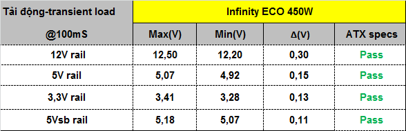 Infinity ECO 450W hoàn thành các mức tải với hiệu suất duy trì trên 80% đúng như những gì phía Infinity cam kết. Có thể thấy sự hụt hơi của thiết kế “ truyền thống” so với thiết kế sử dụng mạch DC to DC ở sự ổn định về điện áp đầu ra ở mức tải CL3/5 . Tất nhiên ở tầm giá của ECO450W chúng ta khó để có DC to DC