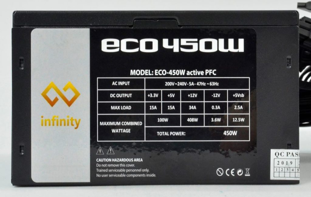 Công suất danh định của Infinity ECO 450W: 450W, Active PFC short range, Single rail 12V@34A