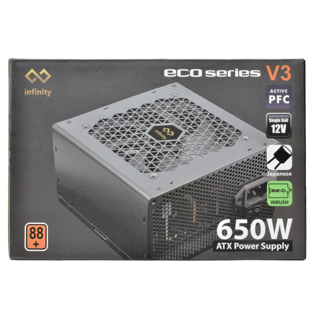 Hộp của ECO 650W V3 có kích thước nhỏ nhắn, tông màu xám đen tương tự dòng sản phẩm ECO series 450/650. Các thông số về điện áp và số lượng đầu cắm kết nối được Infinity in ở các mặt hông của hộp
