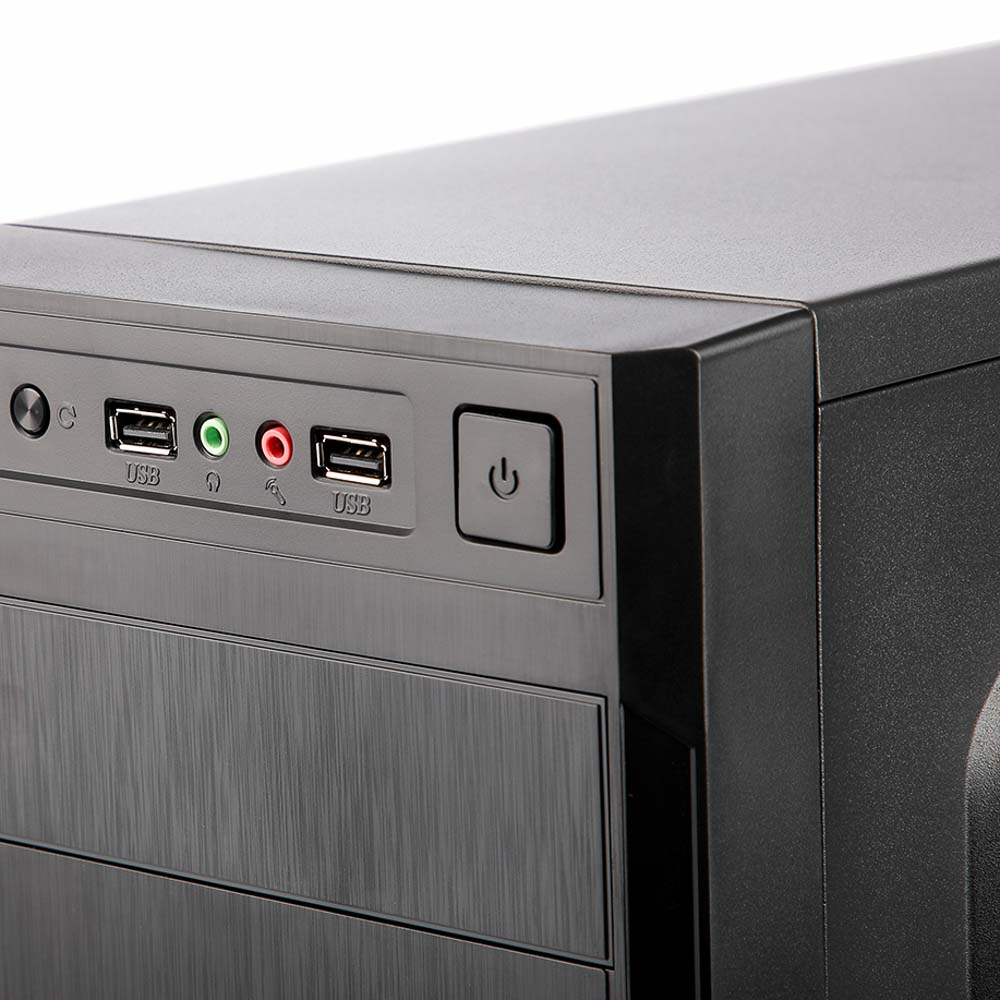 Phần Panel sẽ có 2 cổng USB 2.0, nút Power và nút Reset như thông thường, 1 jack Mic và 1 jack Audio tiện lợi cho nhu cầu sử dụng tai nghe hoặc loa ngoài.