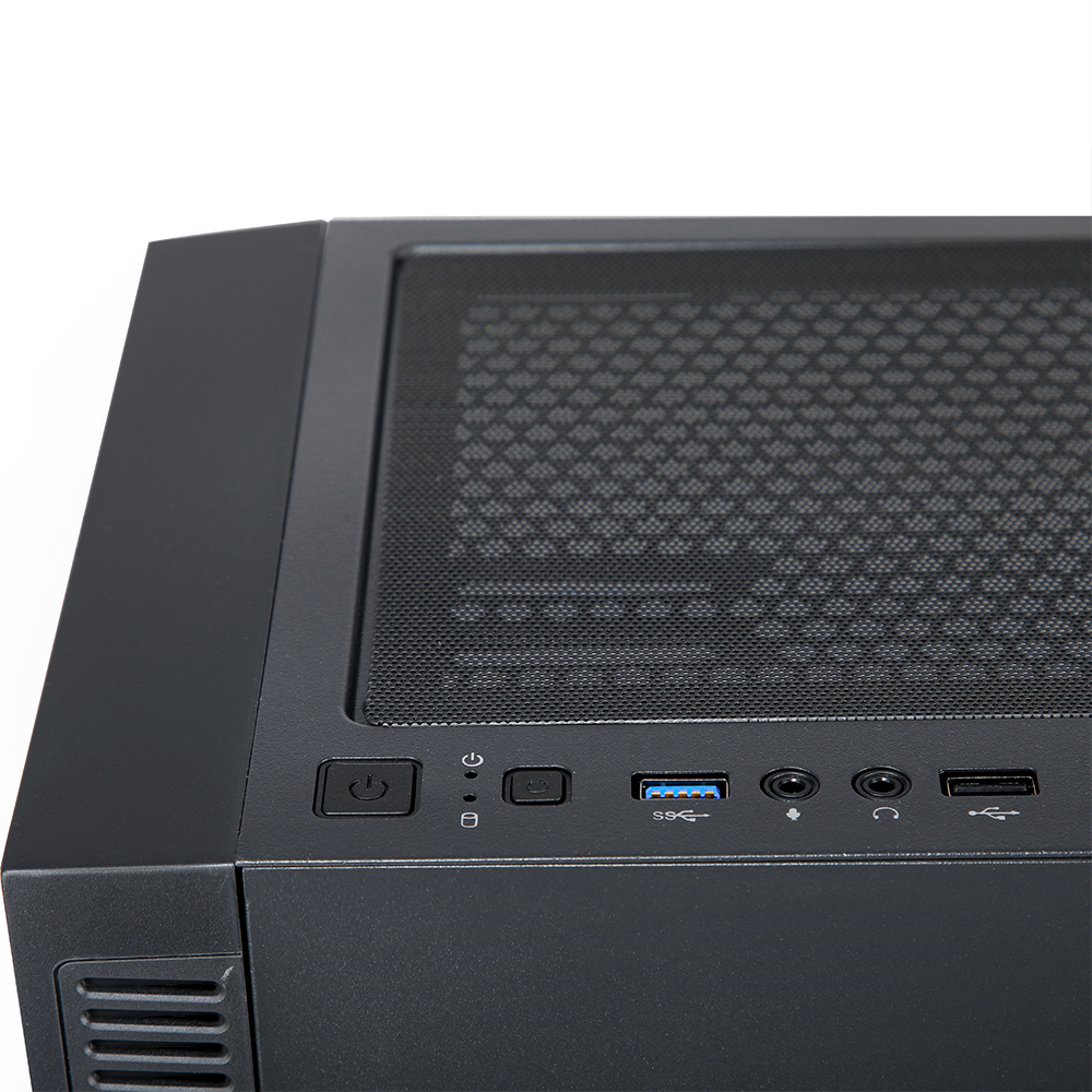 Phần panel phía trước bao gồm các cổng cơ bản như: Power, Reset, Audio, Mic, 1 cổng USB 3.0, 1 cổng USB 2.0, giúp thuận tiện khi sử dụng, kết nối các thiết bị ngoại vi.