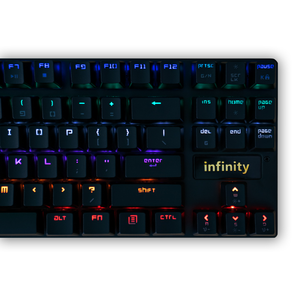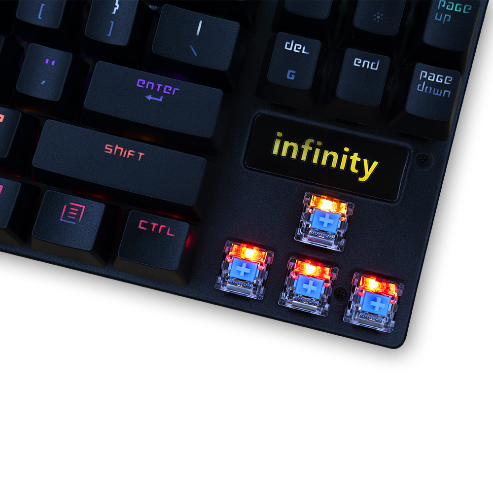 Infinity Troy TKL sử dụng các công tắc quang học, chất liệu gia công của bàn phím cơ Troy TKL là nhựa ABS, Troy TKL có thân hình khá mỏng, cầm trên tay nhẹ hơn so với các sản phẩm khác, tuy nhiên không vì thế mà nó mất đi sự chắc chắn. Đèn Led Addresable RGB nổi trội với nhiều chế độ cũng thực sự ấn tượng.