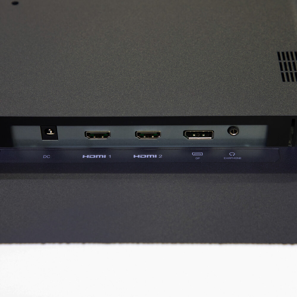 Các cổng kết nối cũng khá cơ bản, gồm 2 cổng HDMI, 1 cổng Display Port, 1 cổng audio 3,5mm (truyền âm thanh qua HDMI hoặc Display Port) và cổng cấp nguồn.