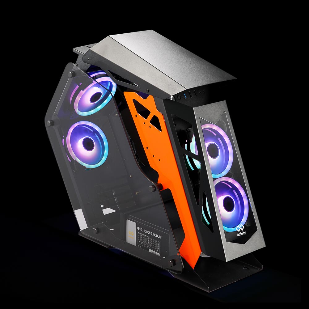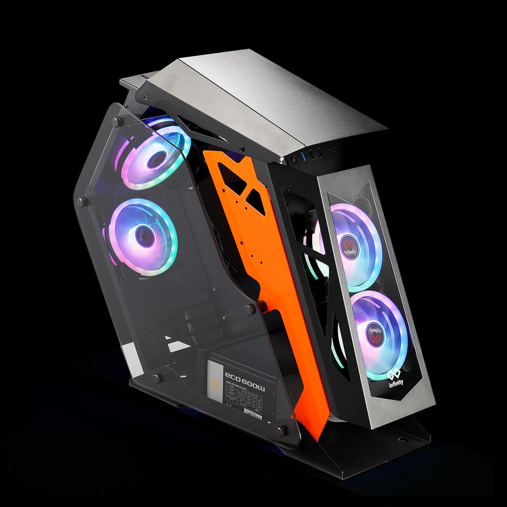 Mặt kính phía trước in logo Infinity nổi bật với tông màu trắng, trong khi mặt bên hông được trang bị kính cường lực và được trang trí khung thép khá dày giúp case nhìn cứng cáp, chắc chắn, làm toát lên vẻ sang trọng của case. Kính cường lực giúp cho nó show ra hết những vẻ đẹp mà nó đang ẩn chứa bên trong.