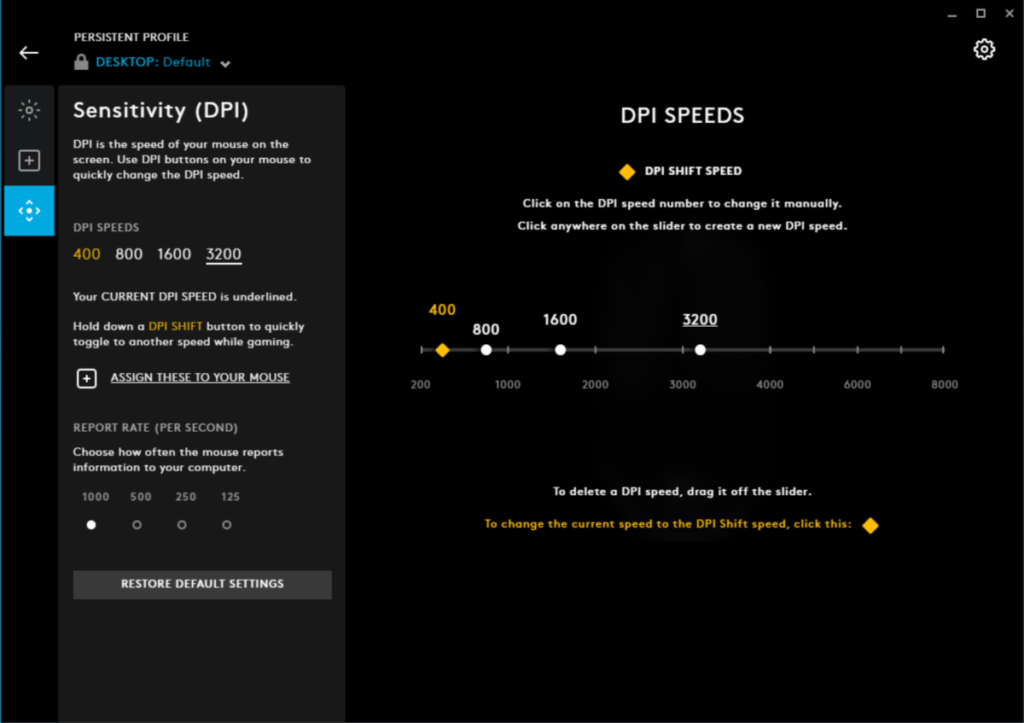 Cảm biến cấp độ chơi game: theo dõi con trỏ chính xác và đạt hiệu xuất phản hồi nhanh nhạy nhờ vào cảm biến cấp độ chơi game. Với độ nhạy có thể chỉnh từ 200 – 8000 DPI, giúp game thủ chọn mức độ phù hợp với sở thích của mình. Sử dụng phần mềm HUB G của Logitech để lập trình lên tới 5 chế độ thiết lập sẵn.