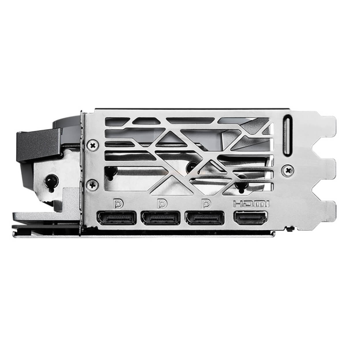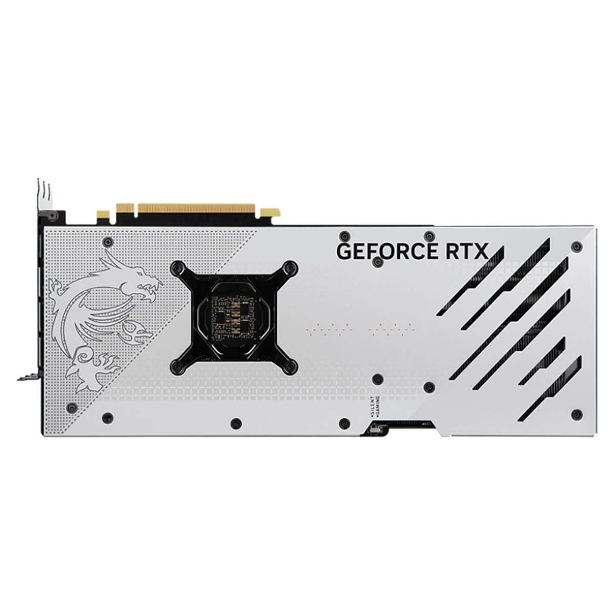 Sức mạnh của MSI GeForce RTX 4070 Ti GAMING X TRIO WHITE 12G sẽ được bảo vệ một cách cẩn thận nhất với phần backplate đầy cứng cáp từ chất liệu kim loại. Ngoài công việc bảo vệ cho phần vi mạch đằng sau của chiếc card màn hình, backplate tô điểm với các chi tiết về GeForce RTX cùng với đó là biểu tượng rồng làm nên thương hiệu của MSI. Các khe tản nhiệt trên đó cũng giúp cho khả năng tản nhiệt của MSI GeForce RTX 4070 Ti GAMING X TRIO tốt hơn, tránh gây bí bách dẫn đến nhiệt độ tăng cao.