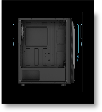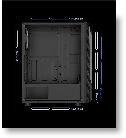 | FAN SUPPORT | Front: 120mm x 3 or 140mm x 2 Top: 120mm x 2 Rear: 120mm x 1 Bottom: 120mm x 2 |
