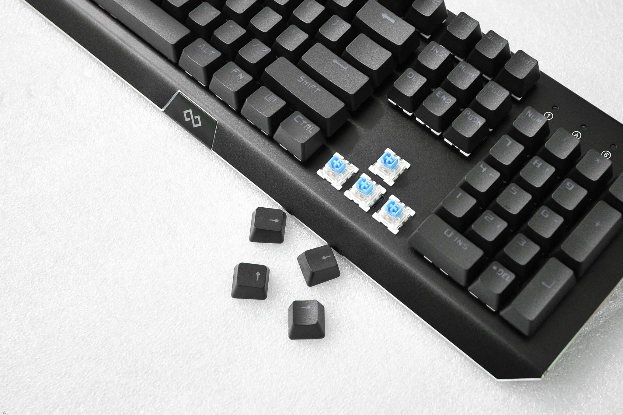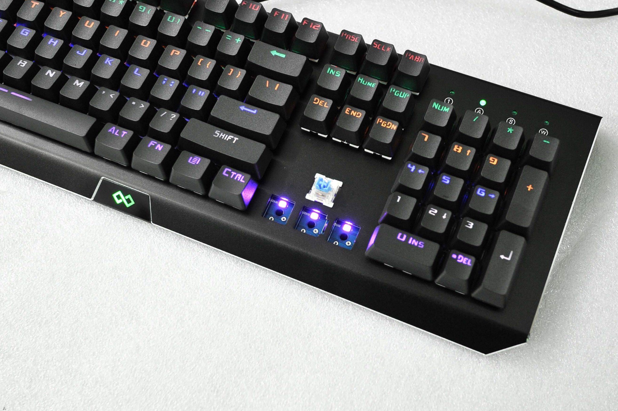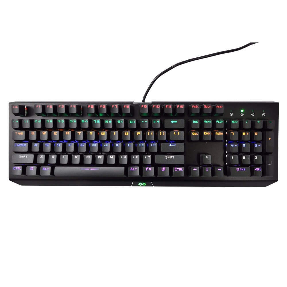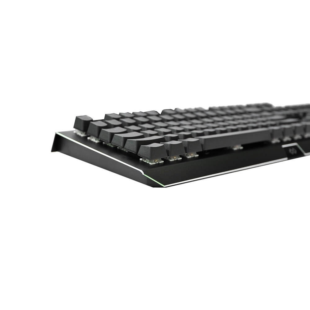 Về cảm quan bên ngoài: Tuy là bàn phím cơ fullsize nhưng lại khá nhẹ, thiết kế đơn giản. Mặt trên là lớp vỏ kim loại đen mờ chống bám vân tay, logo được khắc hơi lệch qua bên phải. Keycap được làm double shot cao cấp cùng bộ blue switch hãng Bsun và thuộc loại có công nghệ CIY có thể thay nóng được. Bàn phím sử dụng led rainbow theo hàng ngang. Dây cáp được trang bị cục chống nhiễu.
